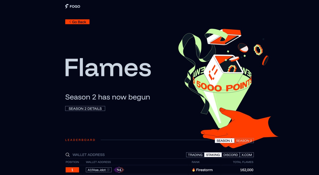 Chương trình điểm thưởng toàn hệ sinh thái, khuyến khích người dùng tương tác với các ứng dụng như Valiant và Pyron để nhận phần thưởng sau này. Website: https://flames.fogo.io/