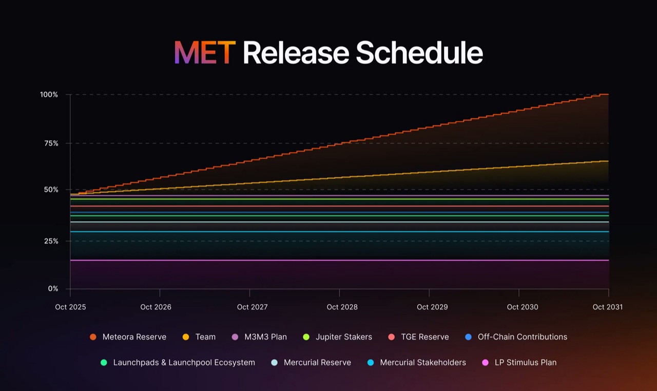 - Quỹ dự trữ Meteora (Meteora Reserve): 34% tổng cung, 0% mở khóa tại TGE, bắt đầu mở khóa sau 1 tháng (cliff) và phát hành dần trong vòng 72 tháng (6 năm).